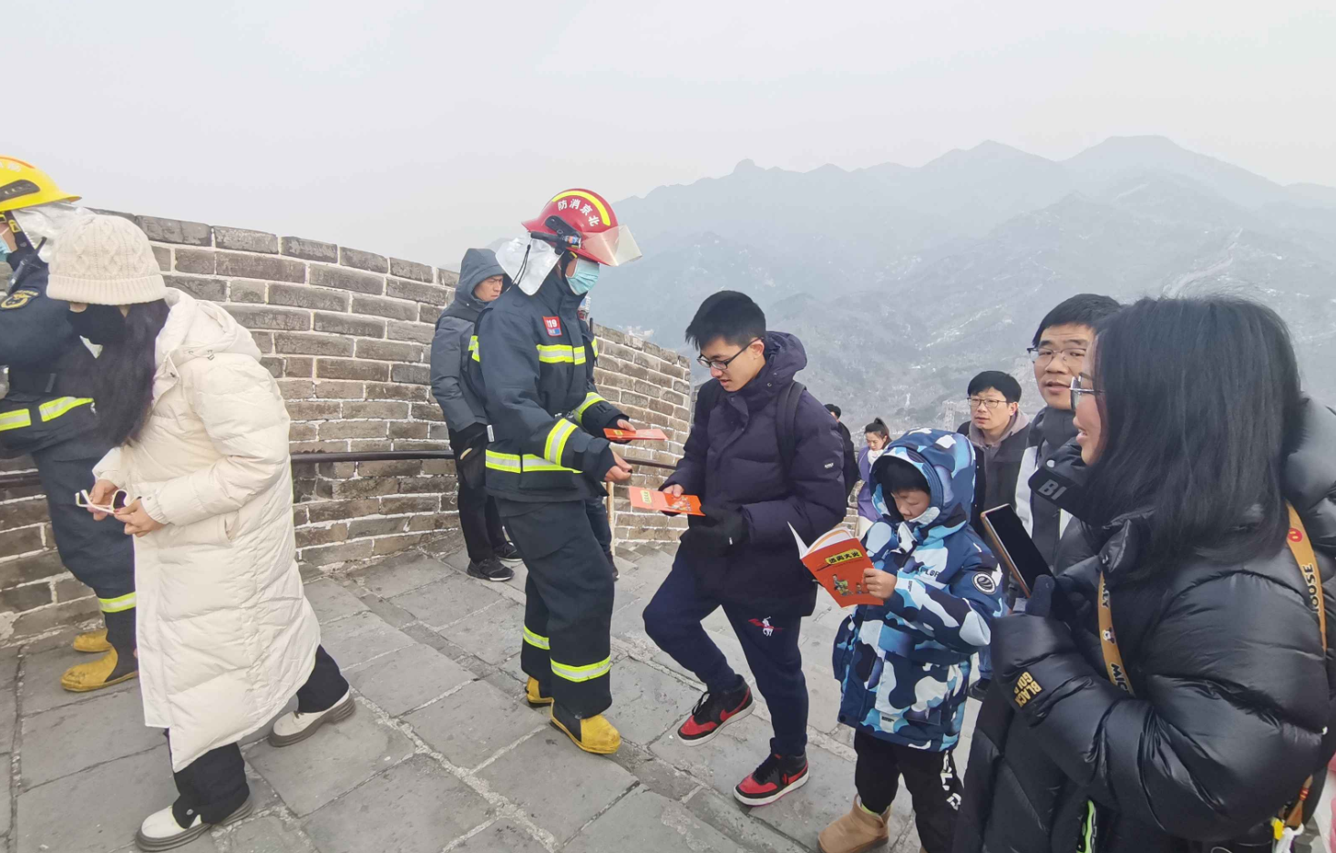 消防宣傳人員在八達(dá)嶺長城上向游客發(fā)放消防安全宣傳冊。 圖源:延慶區(qū)消防救援支隊(duì)